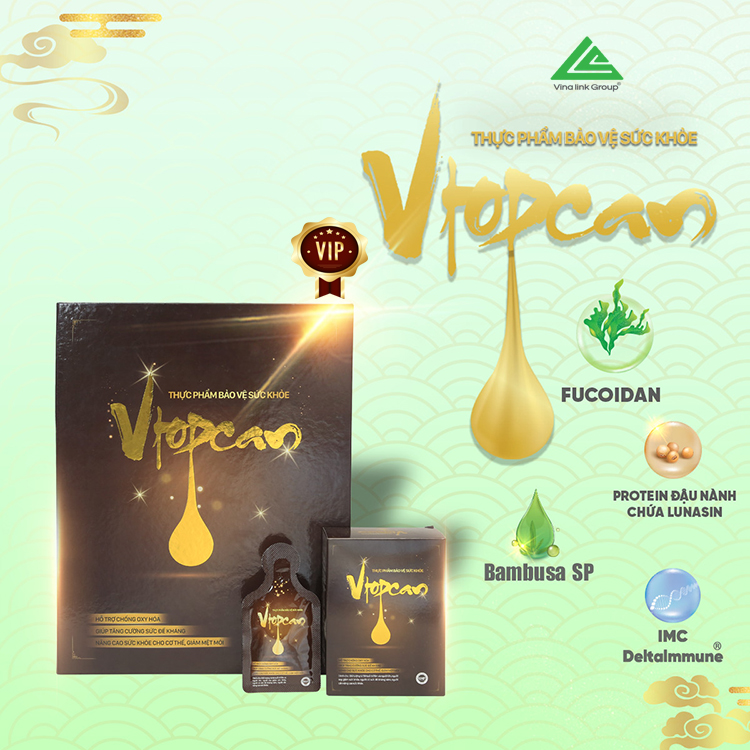 Với thành phần đặc biệt là sự kết hợp của các hoạt chất sinh học nối tiếng thế giới và các thảo dược quý hiếm của Việt Nam, Vtopcan là thực phẩm bảo vệ sức khỏe giúp hỗ trợ chống oxy hóa, hỗ trợ giúp tăng cường sức đề kháng, hỗ trợ nâng cao sức khỏe cho cơ thể, hỗ trợ giảm mệt mỏi.