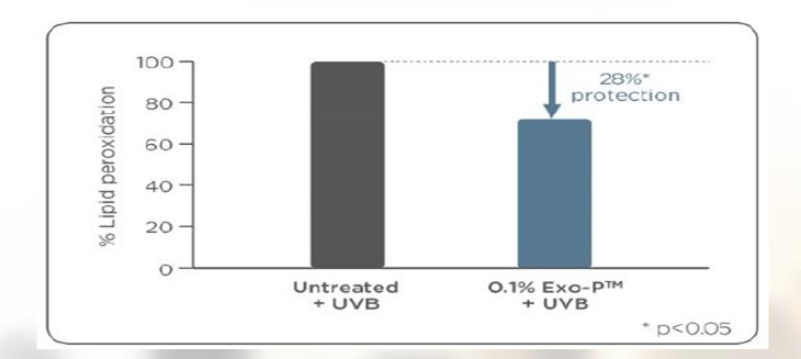 Exo-P™ bảo vệ và ngăn ngừa hư tổn da do các gốc tự do gây ra đã được chứng minh trên in vitro (thử nghiệm trong ống nghiệm). Các tế bào sừng của người được ủ bằng Exo-P™ hoặc đối chứng dương (BHA chống oxy hóa) trong 24 giờ. Các tế bào này được chiếu xạ bằng UVB (cảm ứng các gốc tự do). Sự phân hủy lipid được xác định bằng cảm biến huỳnh quang đặc biệt và được định lượng bằng phép đo đạc tế bào. Kết quả cho thấy Exo-P™ giúp giảm tới 28% sự peroxid hóa chất béo, kết quả có ý nghĩa thống kê với p<0,05.