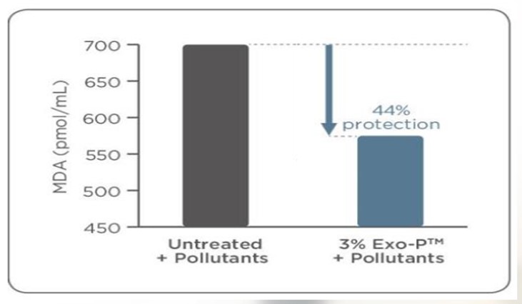 Exo-P™ bảo vệ da và các tế bào chống ô nhiễm thành thị (Giảm các tổn hại do hydrocacbon và kim loại nặng gây ra) được chứng minh bằng thử nghiệm Ex vivo (trên tế bào người) có đối chứng. Người ta áp giấy lọc có chứa kim loại nặng và hydrocarbon lên sinh thiết tế bào da người (64 tuổi) trên hai mô hình có sử dụng và không sử dụng Exo-P™ trong vòng 4 ngày trước đó. Sau 1 ngày tiến hành bỏ giấy lọc và quan sát mô học và định lượng MDA (phần còn lại của phản ứng phân hủy oxy hóa khử lipid trên). Kết quả cho thấy, trên mô hình sử dụng Exo-P™ giảm lượng MDA xuống 44% trong điều kiện ô nhiễm thành thị nhờ đó ngăn ngừa lão hóa sớm và kích ứng da. Ngoài ra, Exo-P™ giúp giữ gìn tính nguyên trạng của tế bào và cải thiện sự gắn kết lớp trung bì để ngăn ngừa lão hóa sớm.