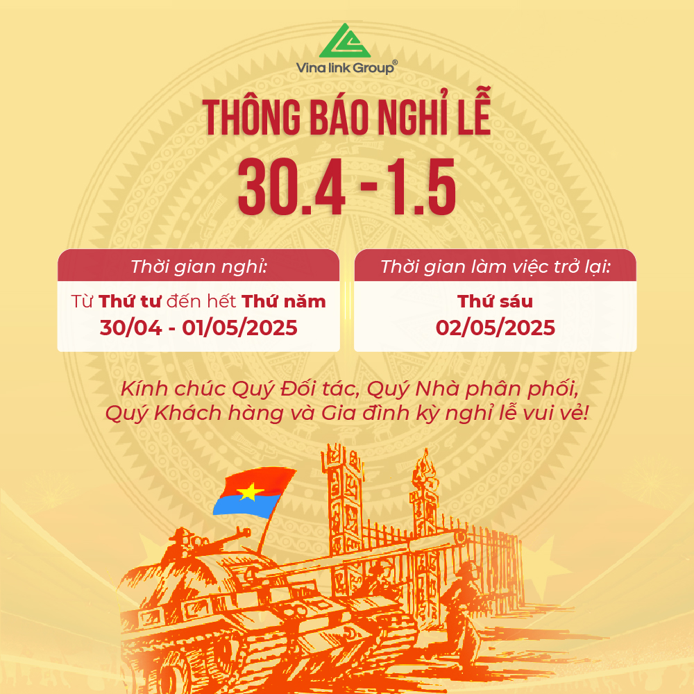 Kính gửi Quý Đối tác, Quý Nhà phân phối, Quý Khách hàng, Vinalink Group trân trọng thông báo lịch nghỉ lễ nhân kỷ niệm ngày Giải phóng miền Nam 30/4 và Quốc tế Lao động 1/5/2025 như sau:
