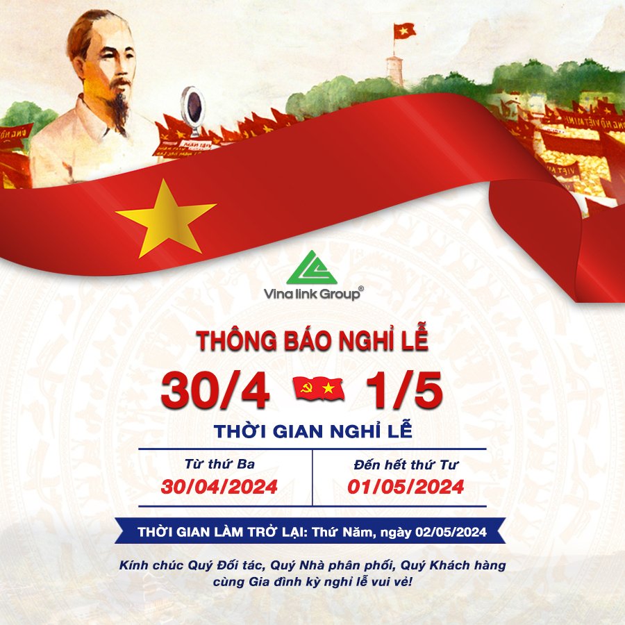 Trân trọng thông báo tới Quý Đối tác, Quý Nhà phân phối, Quý Khách hàng: Lịch nghỉ lễ của Vinalink Group nhân ngày Giải phóng miền Nam 30/4 và Quốc tế Lao động 1/5/2024 như sau: