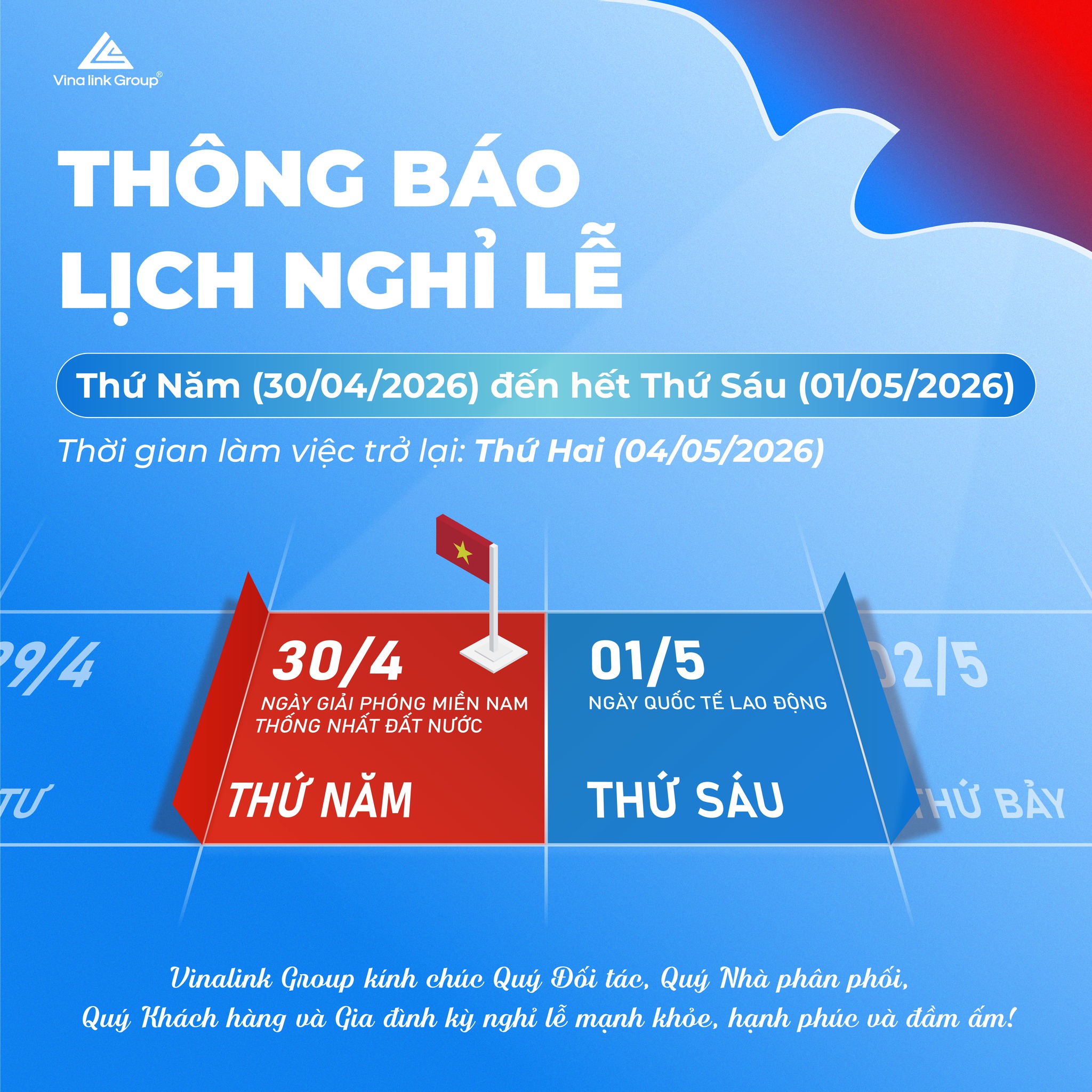 Kính gửi Quý Đối tác, Quý Nhà phân phối, Quý Khách hàng, Vinalink Group trân trọng thông báo lịch nghỉ lễ nhân ngày Giải phóng miền Nam 30/4 và Quốc tế Lao động 1/5 như sau: