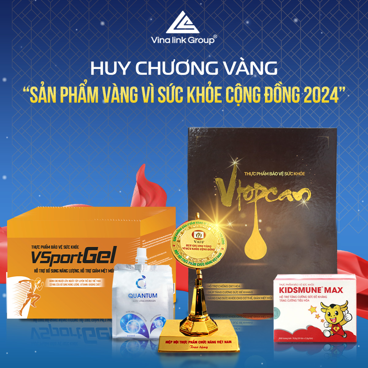 Bên cạnh đó, Vinalink Group còn đạt giải “Huy chương Vàng vì sức khỏe cộng đồng năm 2024” cho 4 sản phẩm: Thực phẩm bảo vệ sức khỏe Kidsmune Max, Thực phẩm bảo vệ sức khỏe Vtopcan, Thực phẩm bảo vệ sức khỏe VSportGel, Nước uống Hydrogen Quantum.
