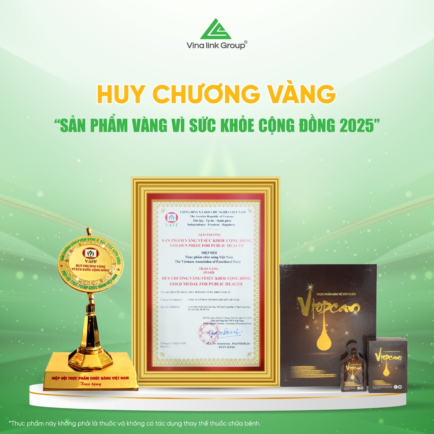 Tại lễ trao giải “Sản phẩm Vàng vì Sức khỏe Cộng đồng năm 2025” do Hiệp hội Thực phẩm Chức năng Việt Nam (VAFF) tổ chức, Vinalink Group đã vinh dự nhận giải thưởng “Huy chương Vàng vì Sức khỏe Cộng đồng” cho 5 sản phẩm nổi bật...