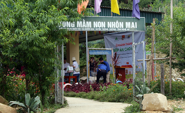 Lễ cắt băng khánh thành "Bếp ăn cho em" tại trường mầm non bản Huồi Cọ - Ảnh: Sức khỏe+