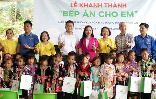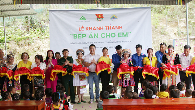Lãnh đạo Vinalink Group, đại diện Tỉnh ủy Nghệ An, Tỉnh đoàn Nghệ An, Huyện ủy Tương Dương, Huyện đoàn Tương Dương, Đồn biên phòng Nhôn Mai, Chính quyền xã Nhôn Mai đã chính thức cắt băng khánh thành “Bếp ăn cho em” - Ảnh: Sức khỏe+
