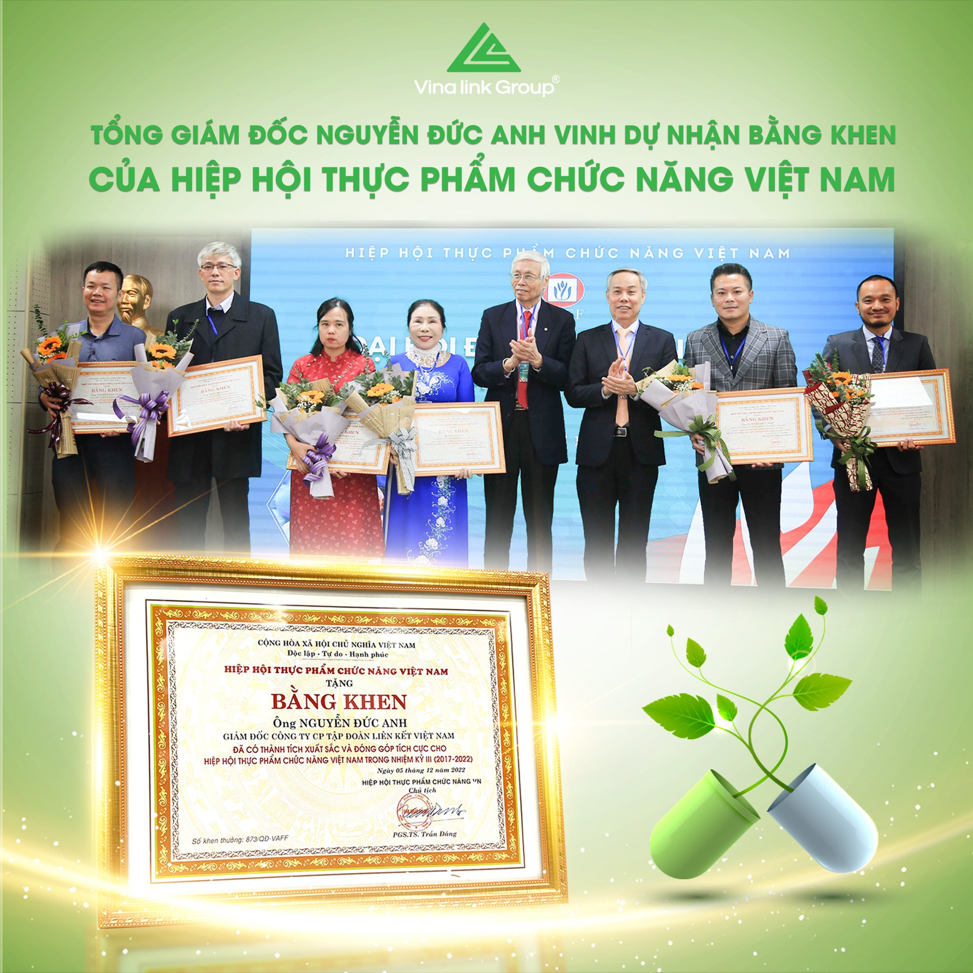 Trong Đại hội Đại biểu của Hiệp hội Thực phẩm chức năng (TPCN) ngày 10/12/2022 vừa qua, Vinalink Group, thành viên của Hiệp hội TPCN đã vinh dự nhận bằng khen cho tổ chức có thành tích xuất sắc và đóng góp tích cực trong suốt nhiệm kỳ III (2017 – 2022).