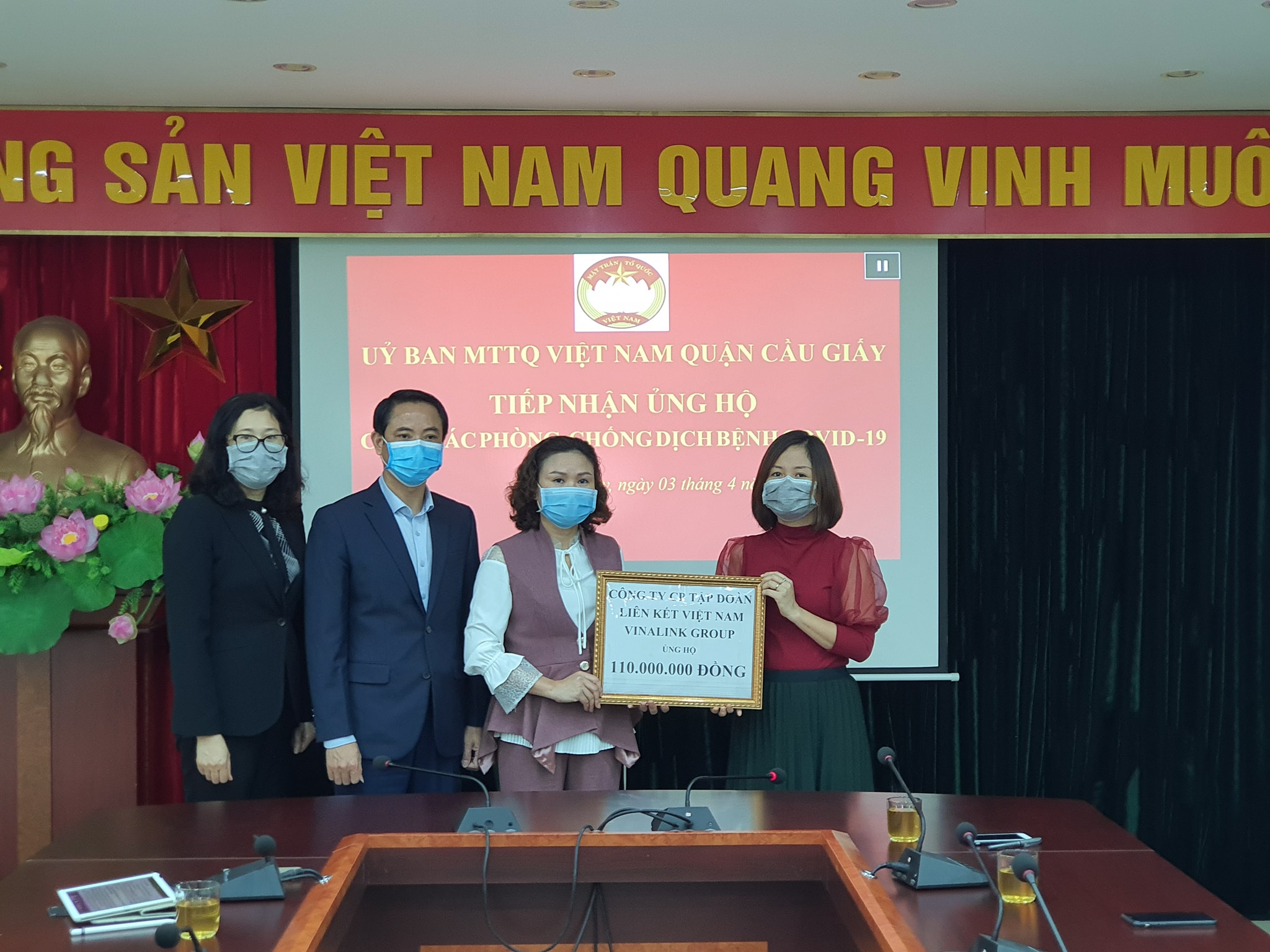 Đồng hành cùng cuộc chiến chống đại dịch của toàn Đảng, toàn dân, toàn quân ta, ngày 03/04/2020, đại diện Vinalink Group - Giám đốc Pháp chế bà Bùi Thu, Trưởng phòng Truyền thông Sự kiện Nguyễn Quang Thực đã thay mặt cho toàn thể CBNV và các NPP trao tặng 110 triệu đồng ủng hộ phòng chống đại dịch Covid - 19 tới UB MTTQ Quận Cầu Giấy, Hà Nội.