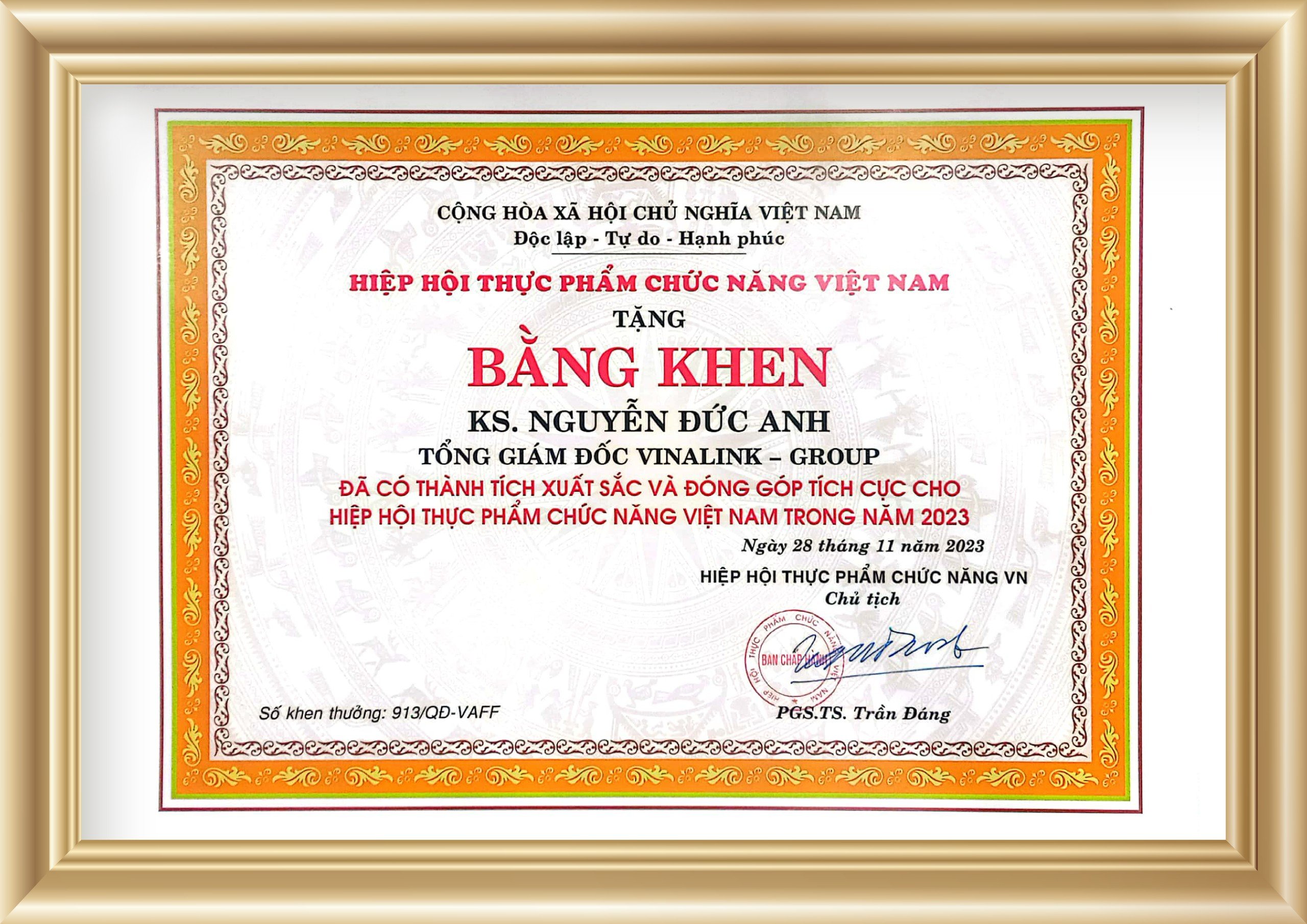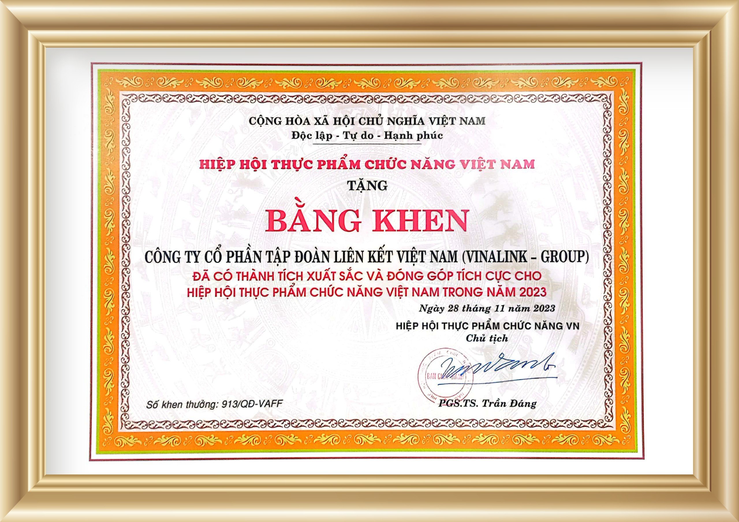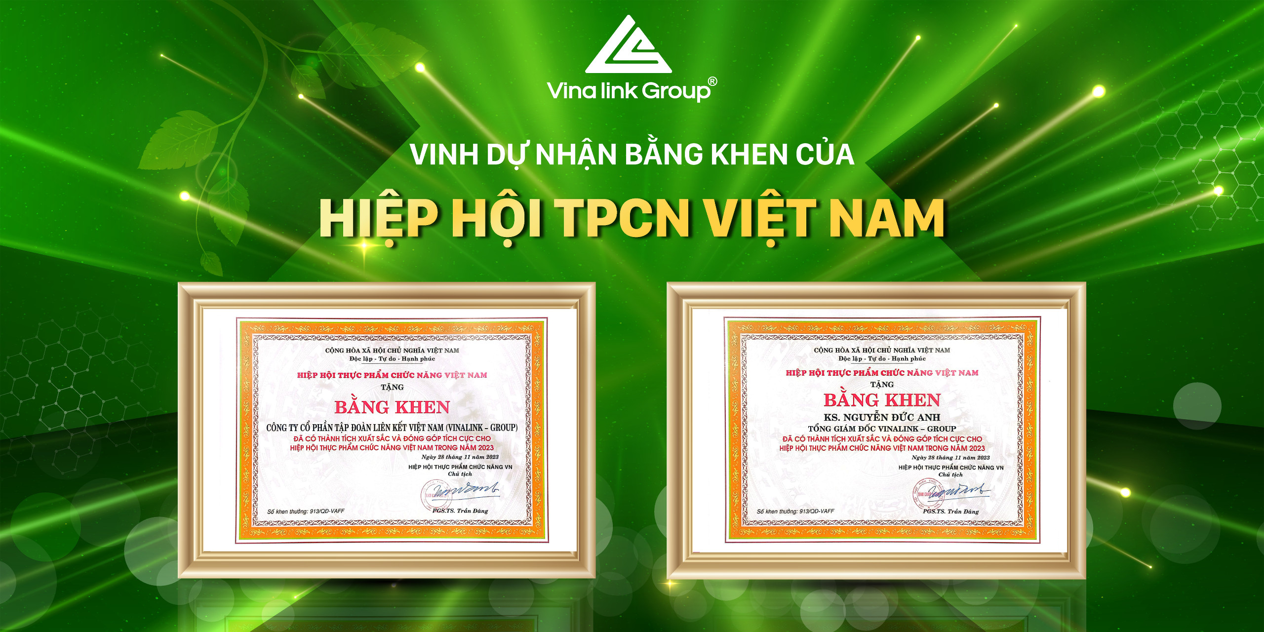 Với thành tích xuất sắc và những đóng góp tích cực cho Hiệp hội Thực phẩm Chức năng (TPCN) Việt Nam năm 2023, Vinalink Group đã vinh dự nhận Bằng khen do Chủ tịch Hiệp hội trao tặng.